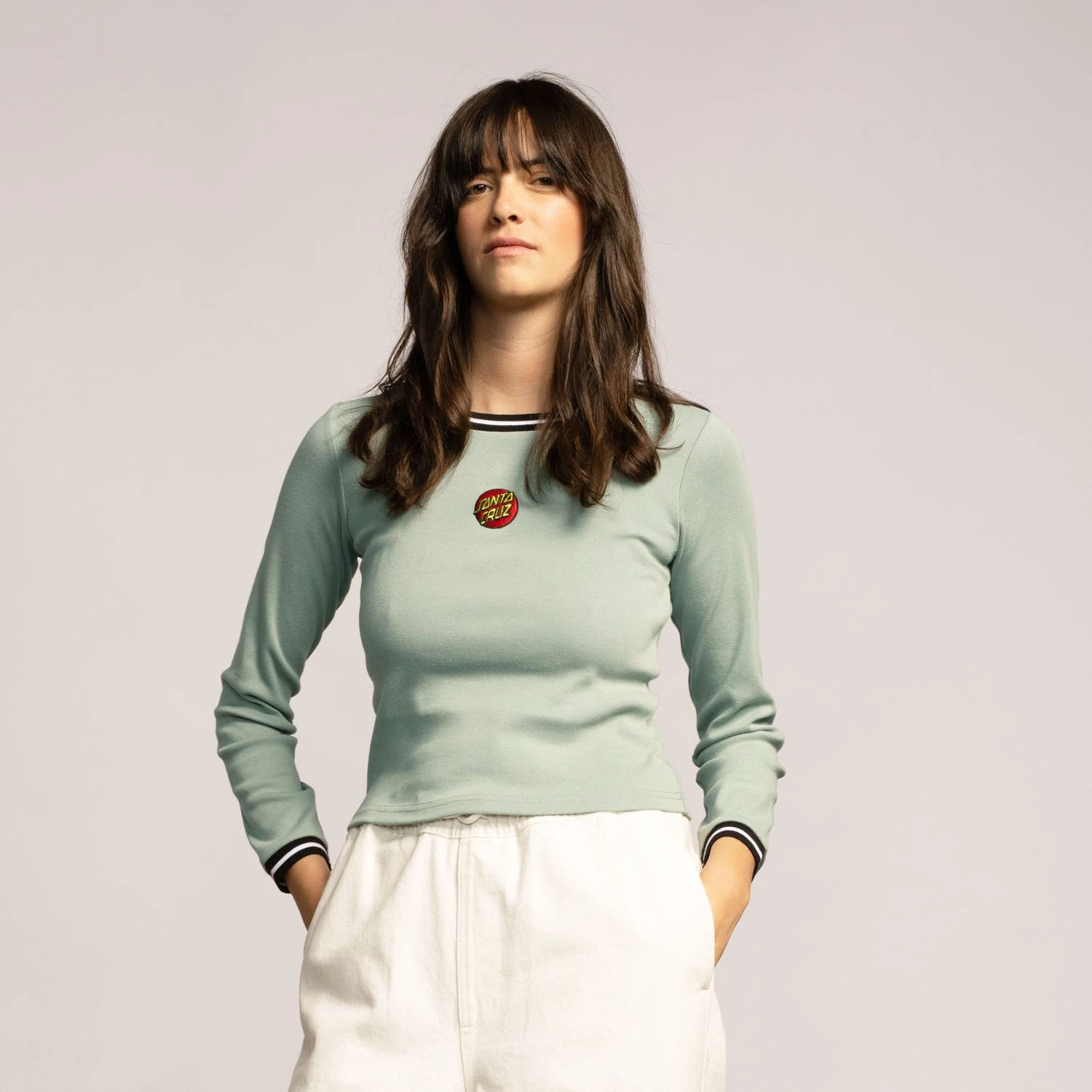 70% cotton, 30% polyester, 210gsm rib jersey, cropped fit, long sleeve t-shirt with contrast rib neck and cuff and chest embroidery