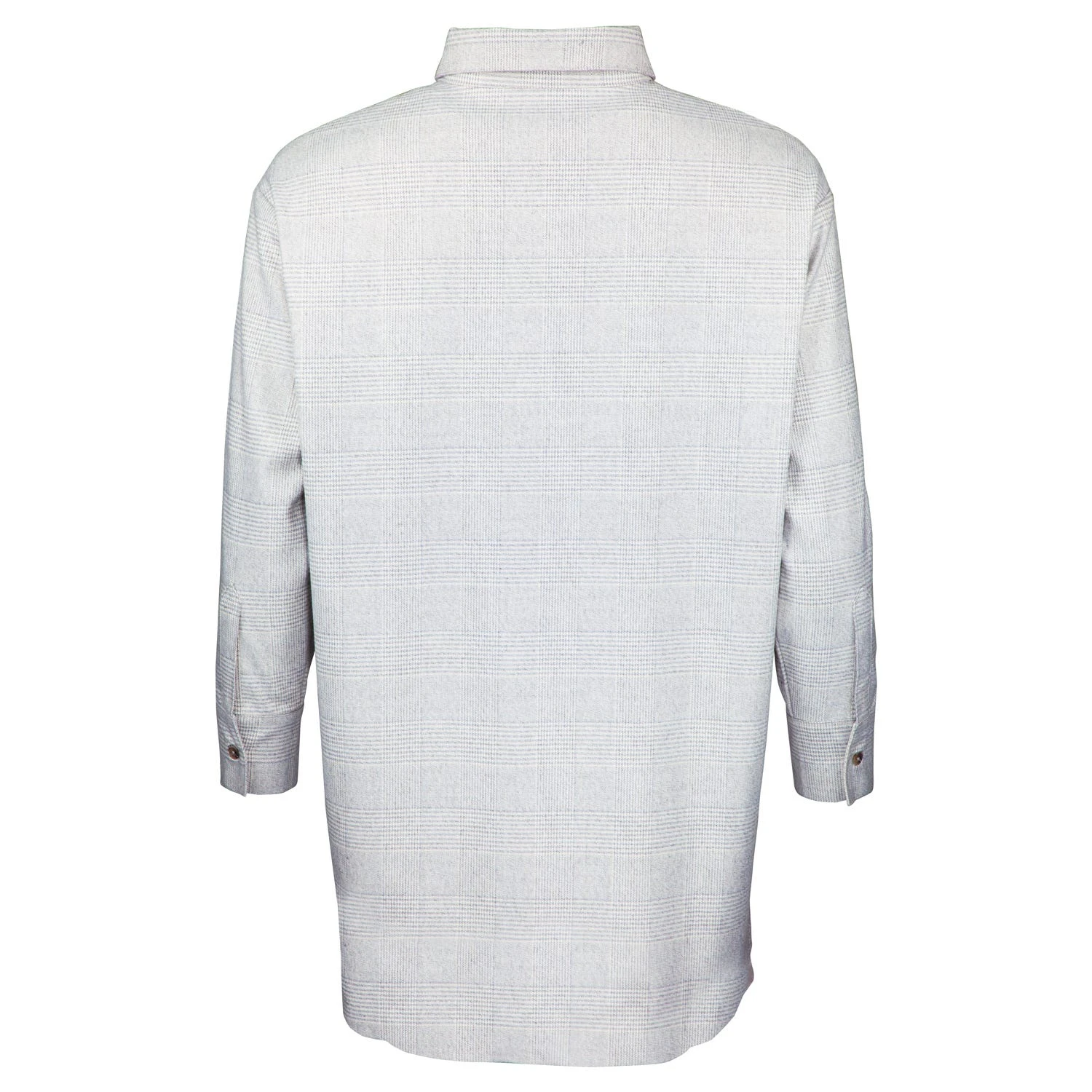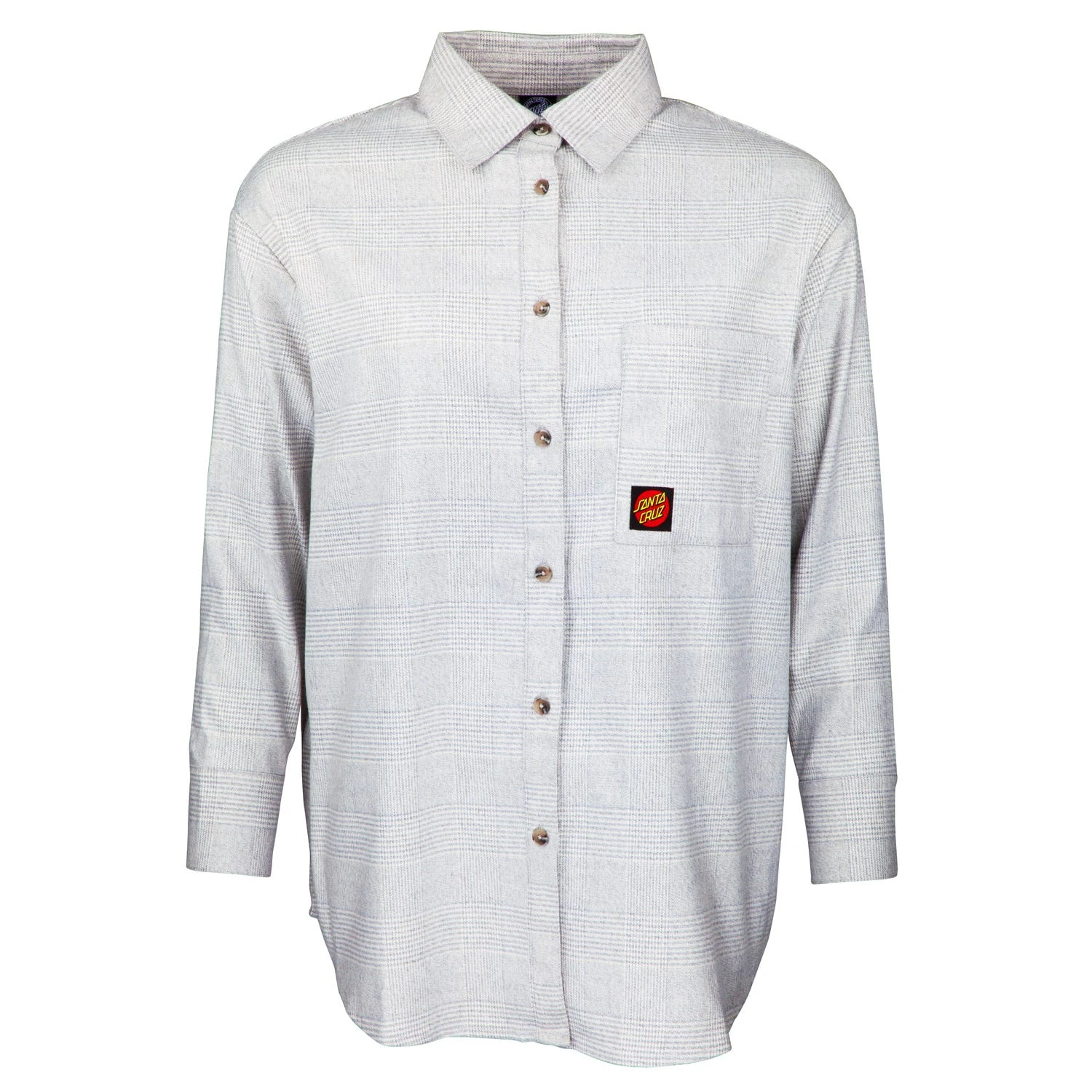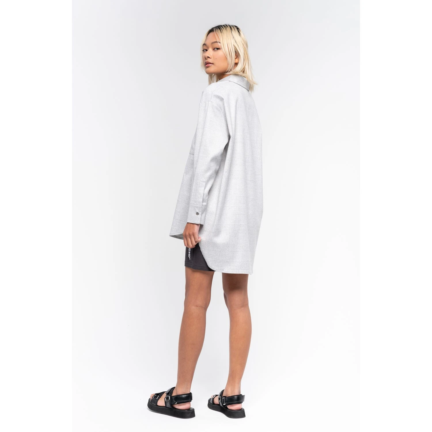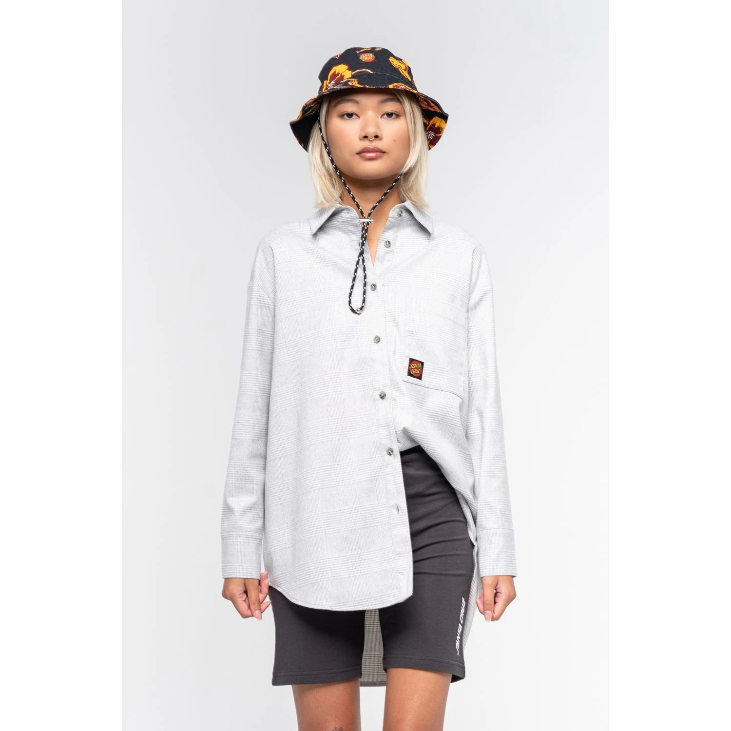 64% polyester, 34% rayon, 2% spandex, oversized fit, long sleeve shirt with chest pocket and woven label branding