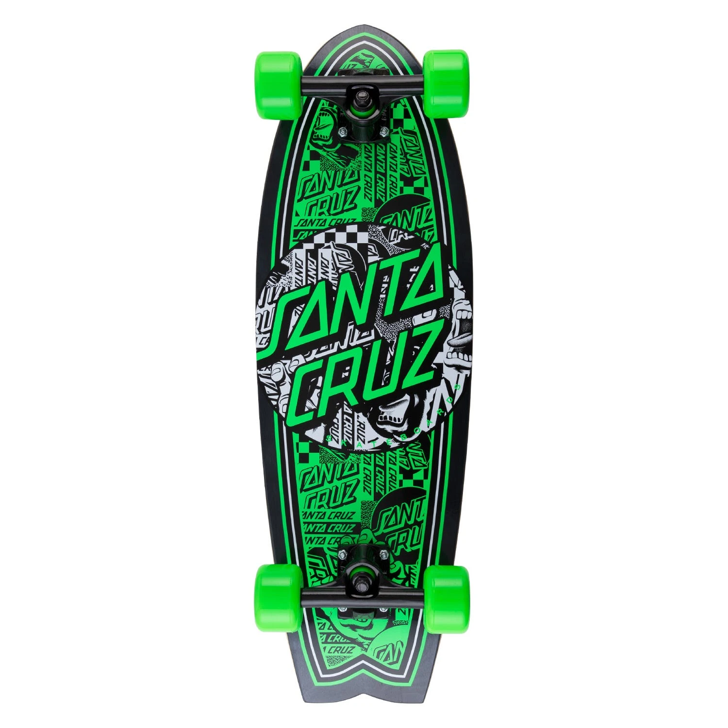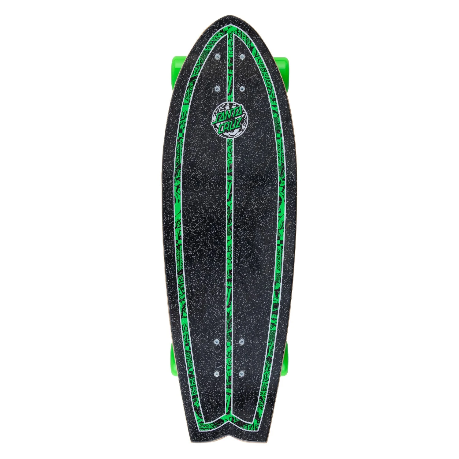 Santa Cruz Skateboards Flier Dot Shark Cruzer with green, black, and white graphic and black, green, and natural veneers on 7 ply surfboard inspired shape with 140mm Bullet trucks, angled risers, Abec 3 bearings and 65mm 78a wheels.