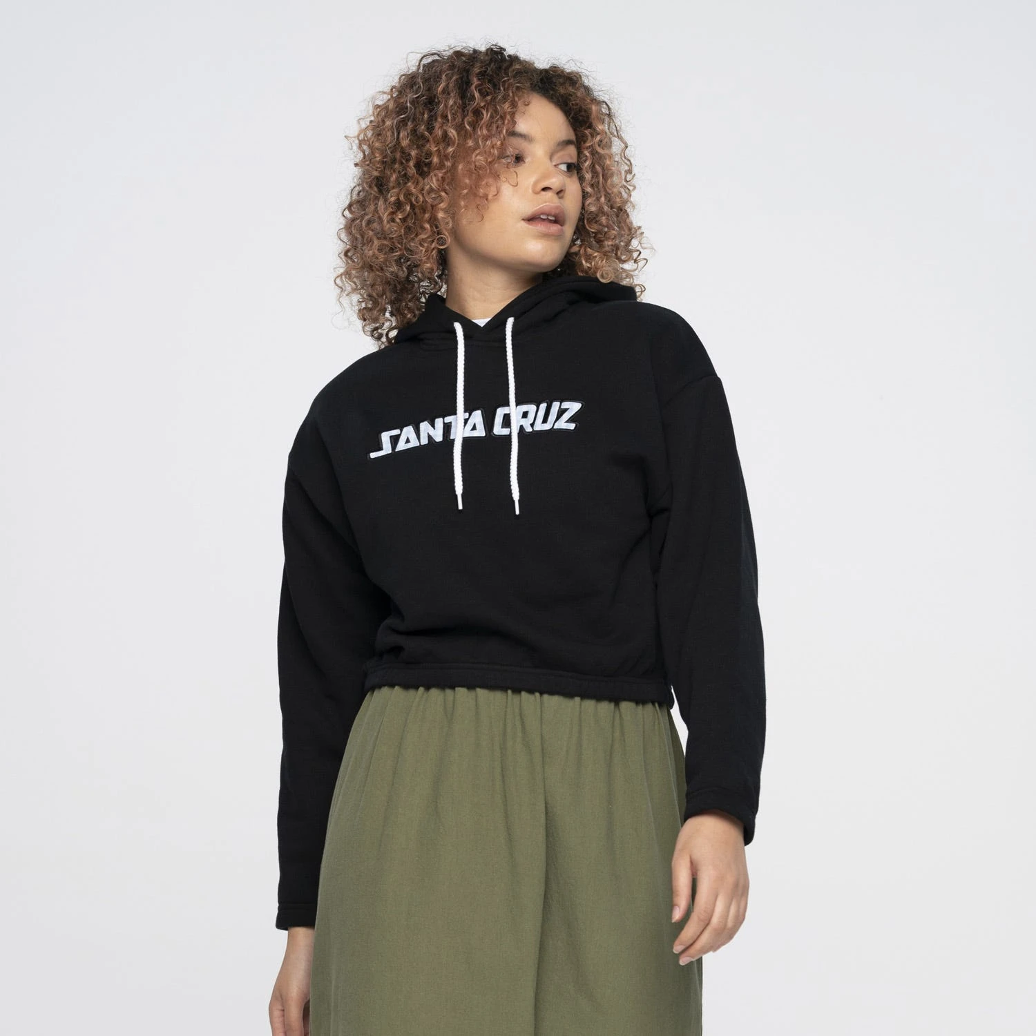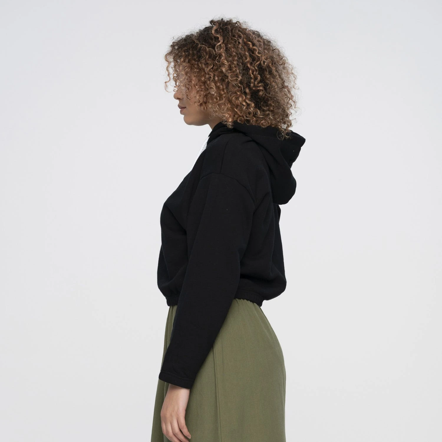 80% cotton, 20% polyester, 330gsm brushed fleece, cropped fit, hooded sweatshirt with elasticated hem and cuffs and chest appliqué