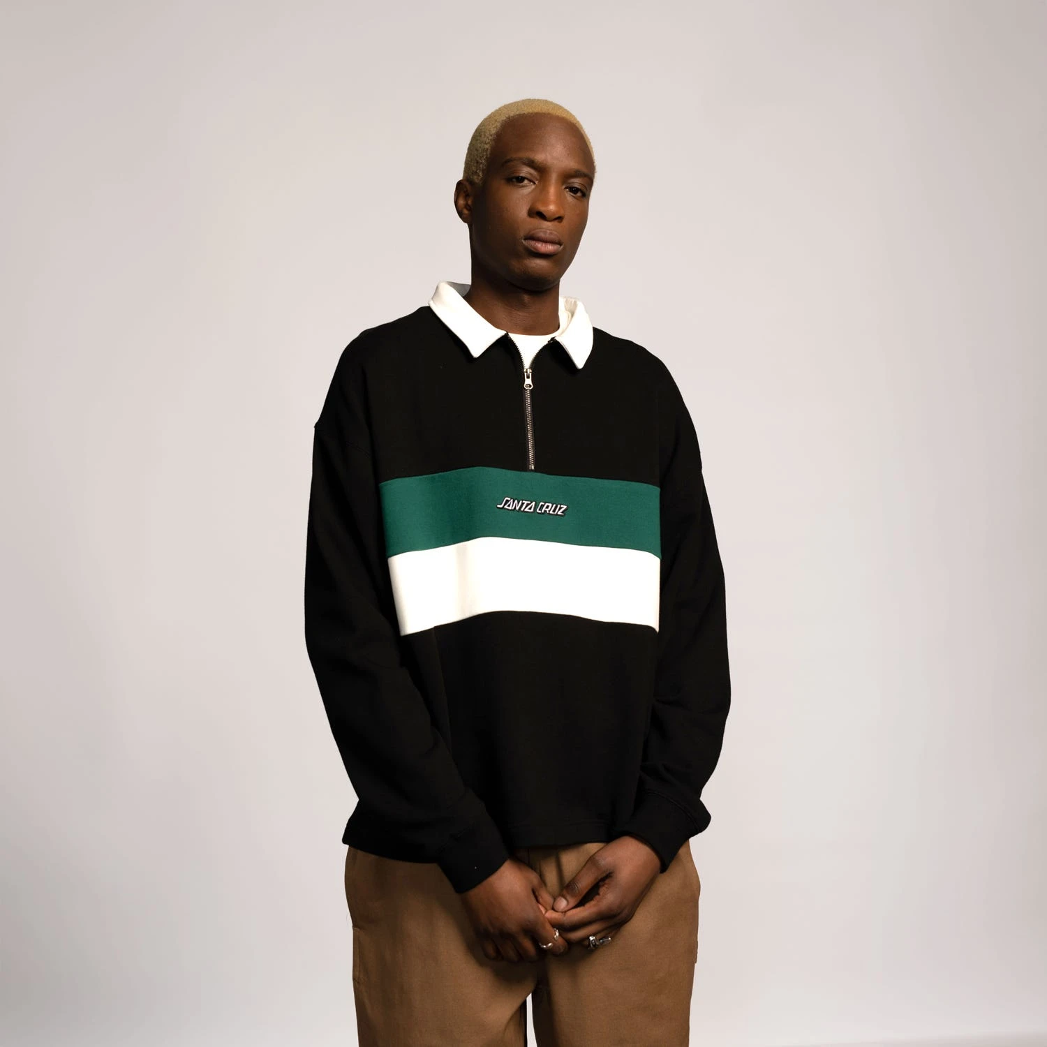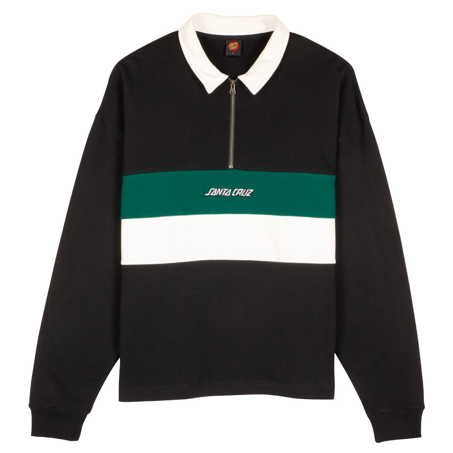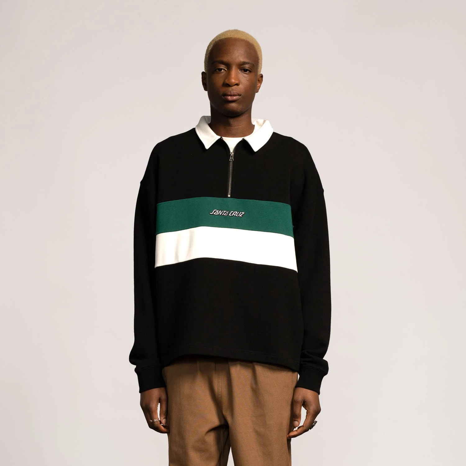 100% organic cotton, 330gsm loopback fleece, boxy fit, zip front crew sweatshirt with body panel stripes and front embroidery