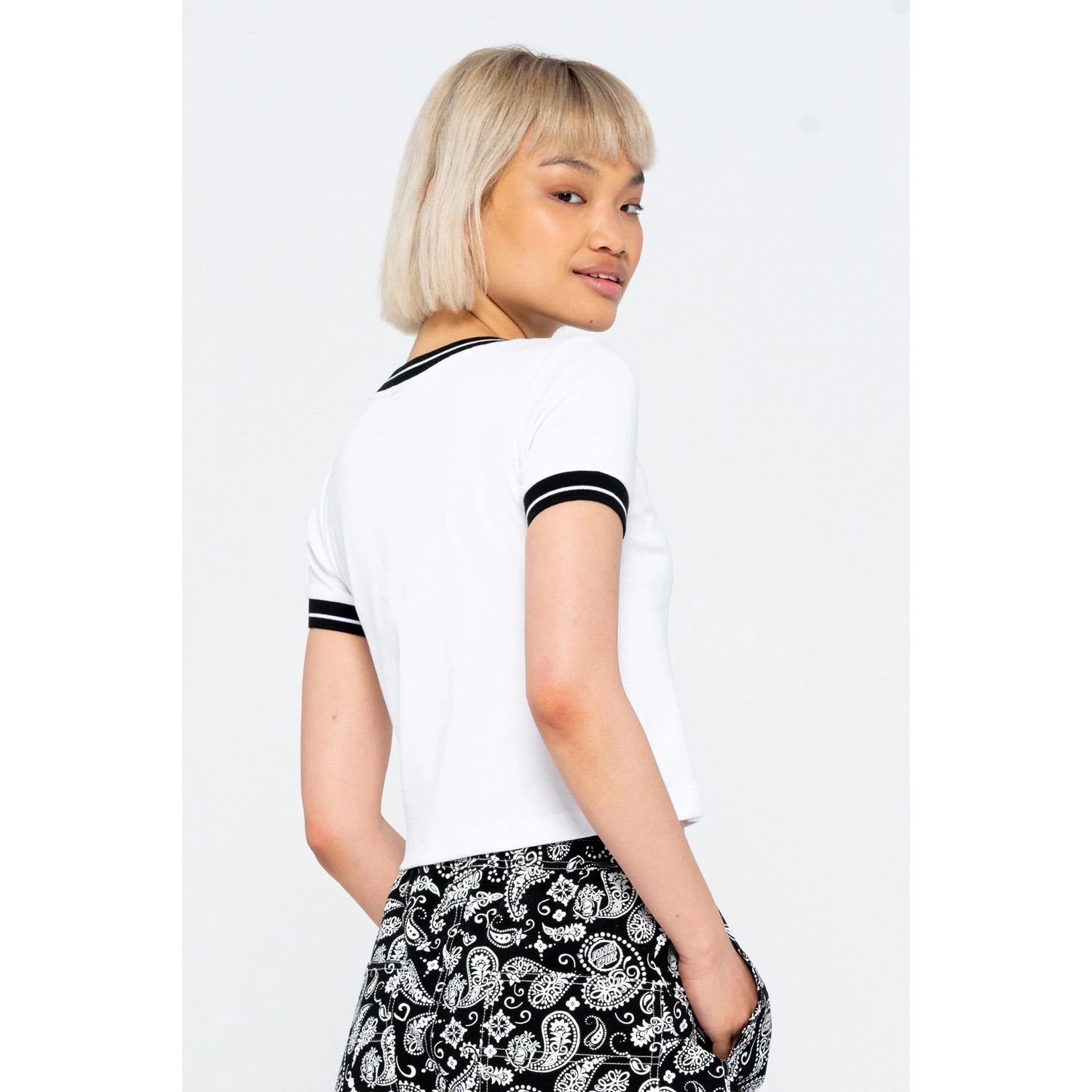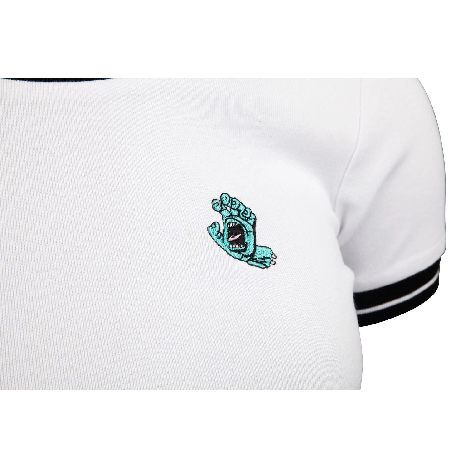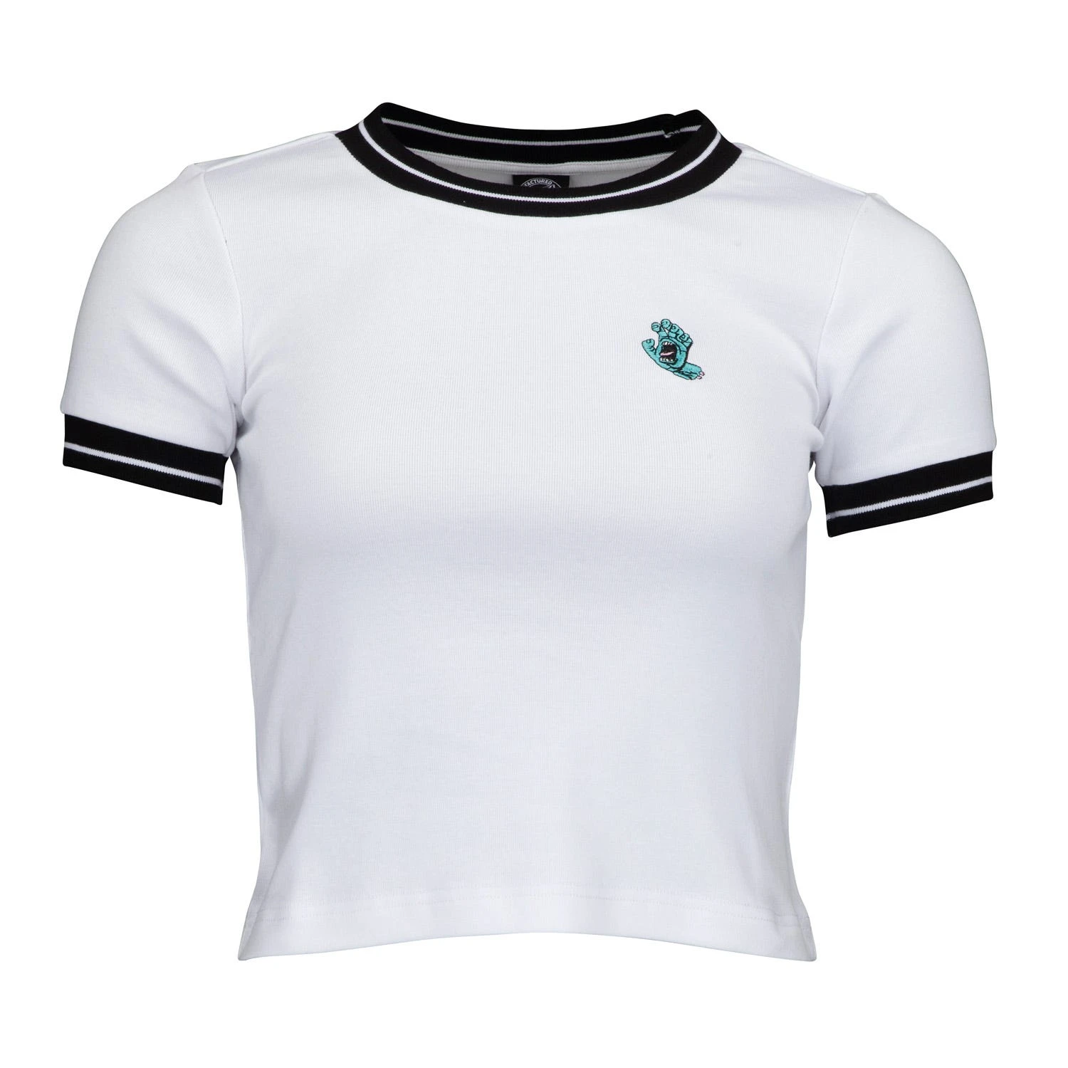 100% cotton, 210gsm rib, cropped, short sleeve ringer t-shirt with left chest embroidery