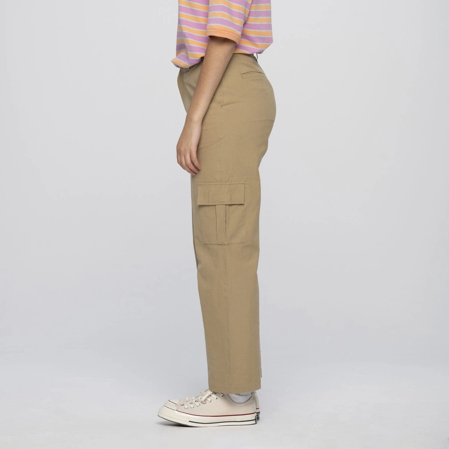 100% cotton, loose fit, wide leg cargo pant with front pockets, back pockets and woven label branding