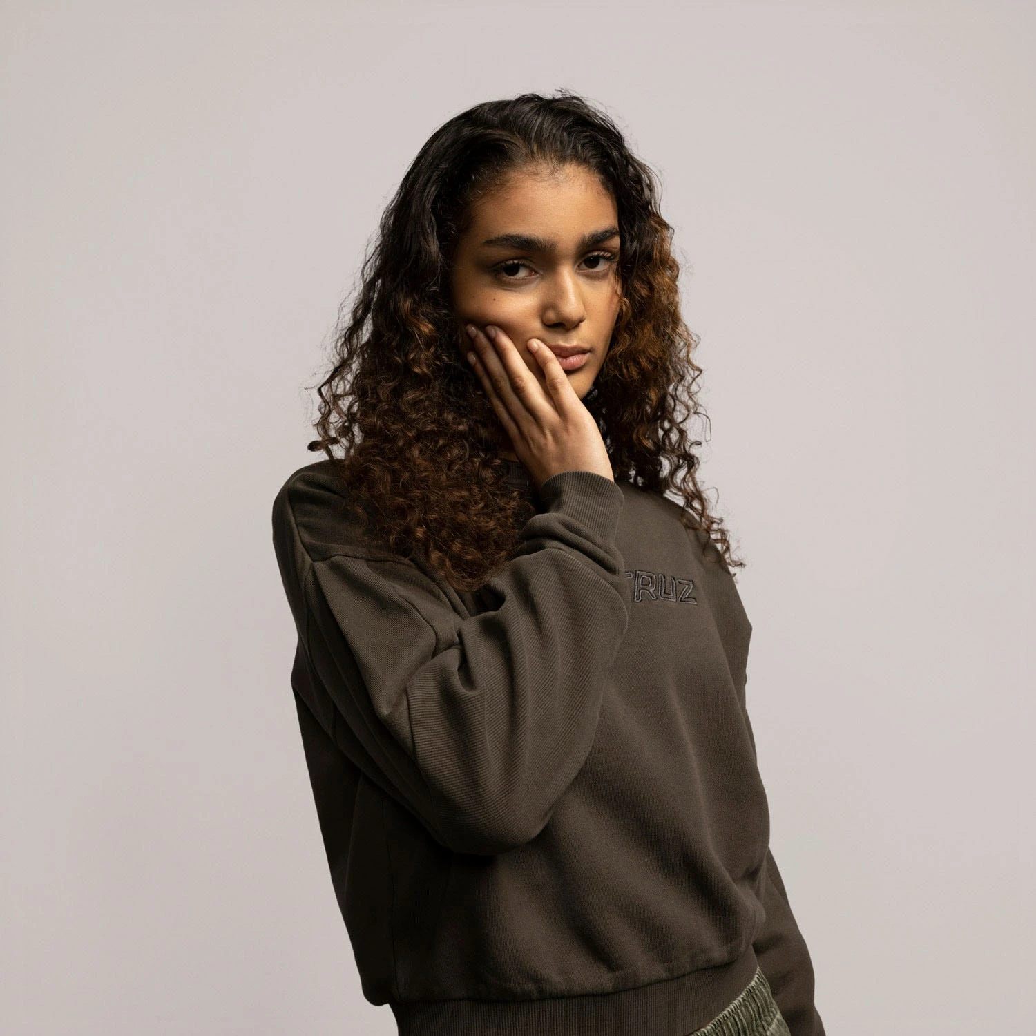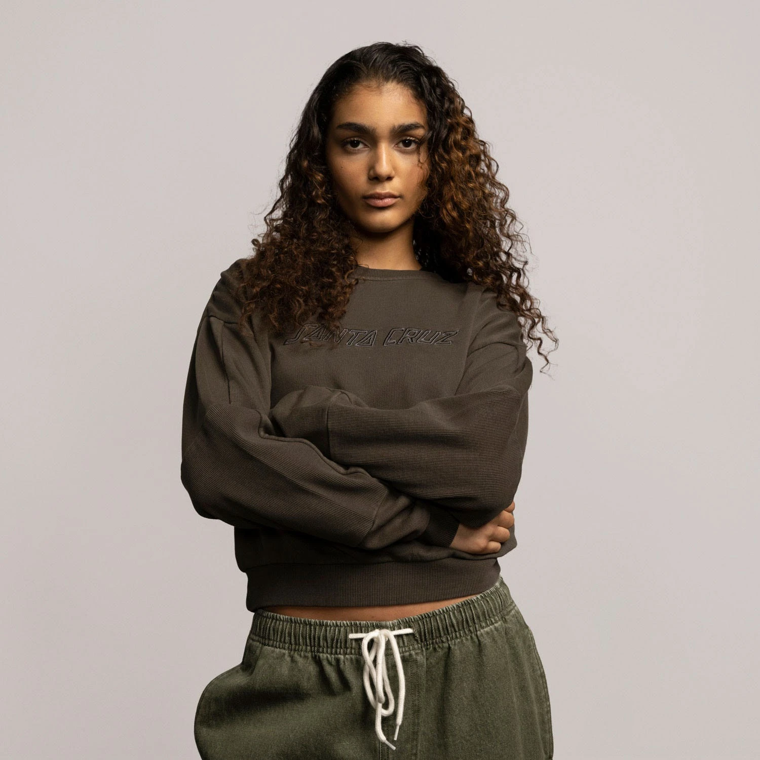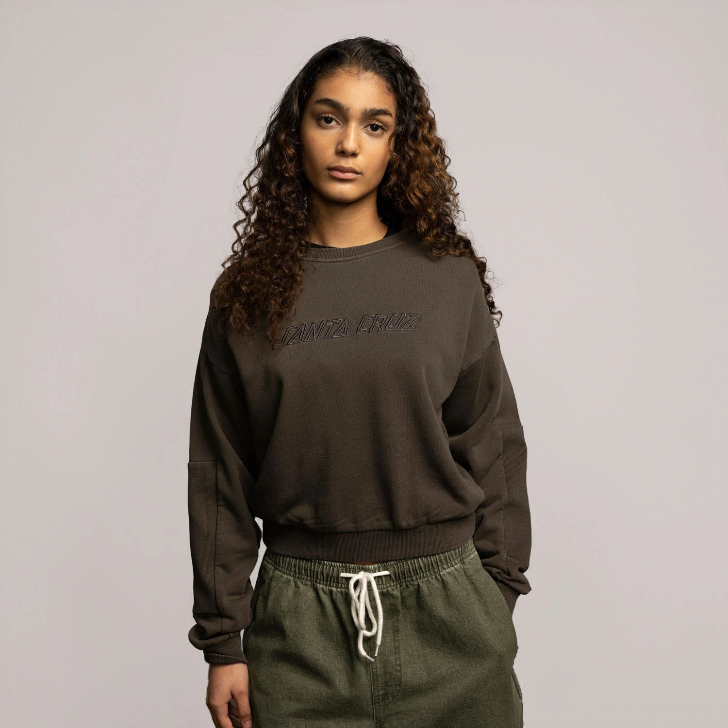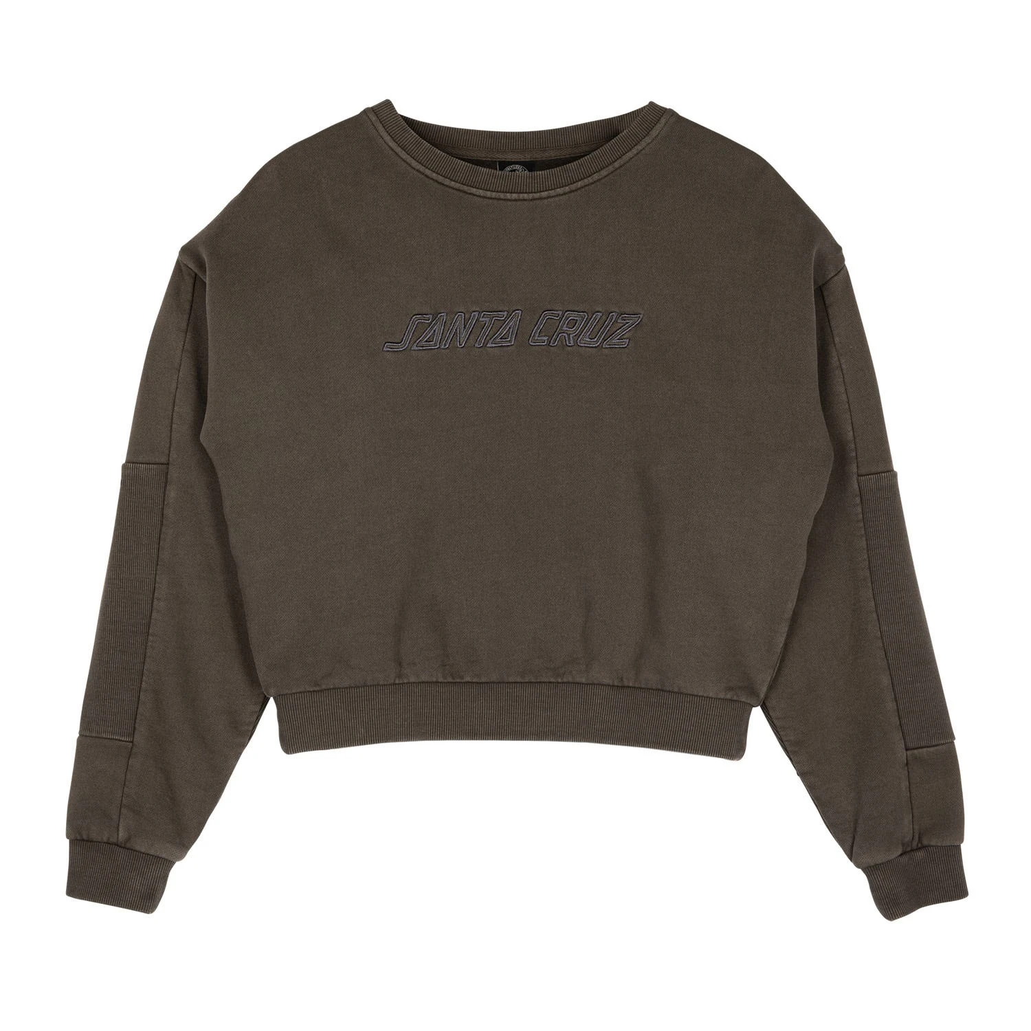 100% cotton, 330gsm loopback fleece, garment dyed, cropped fit, crew sweatshirt with chest appliqué and 2×2 rib sleeve panels