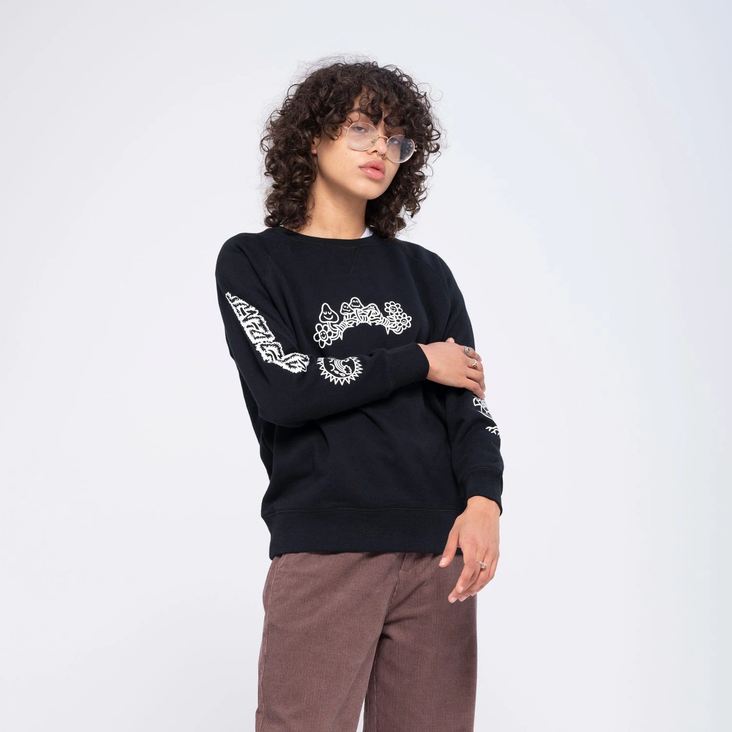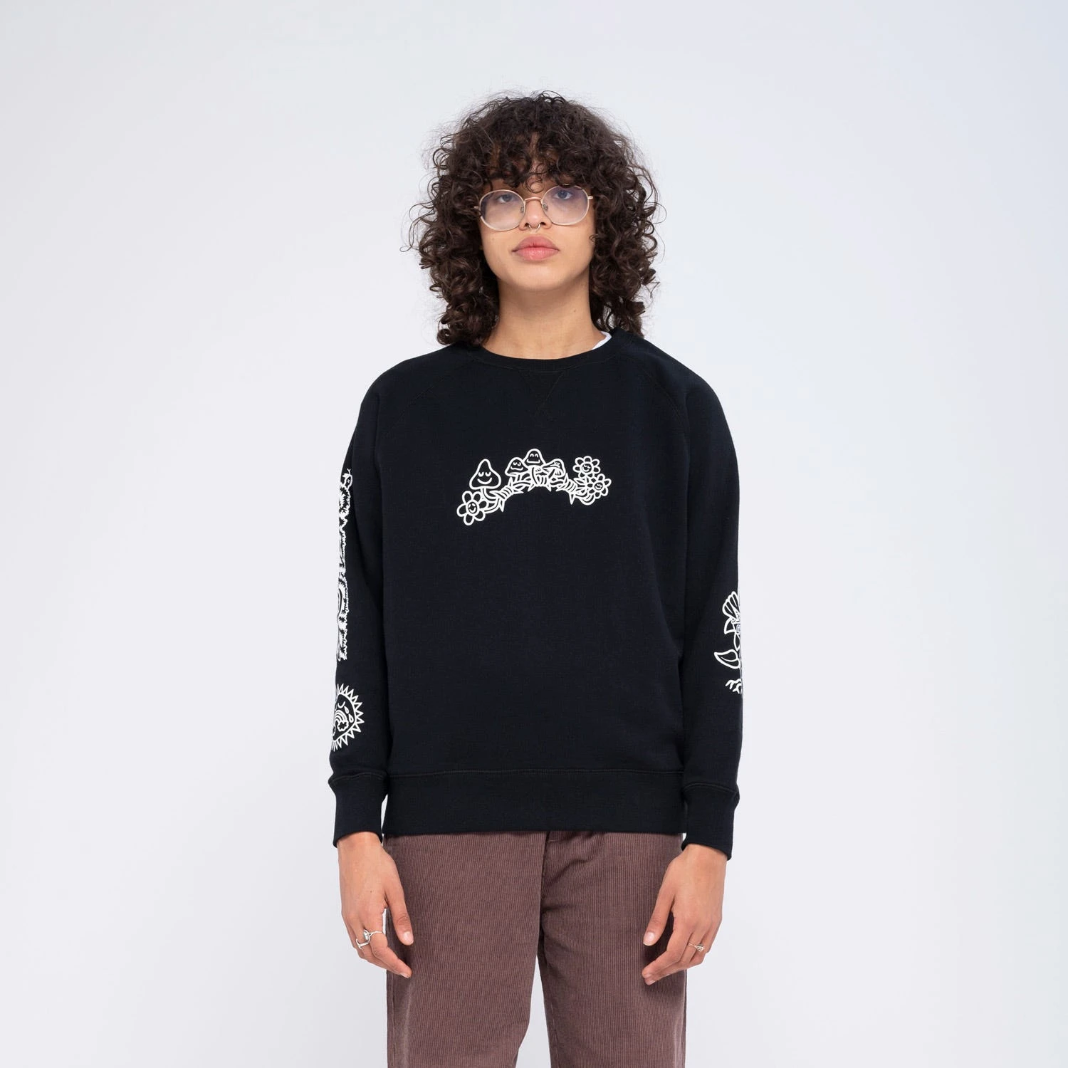80% cotton, 20% polyester, 330gsm brushed fleece, loose fit, raglan crew sweatshirt with front print, sleeve prints and back prints