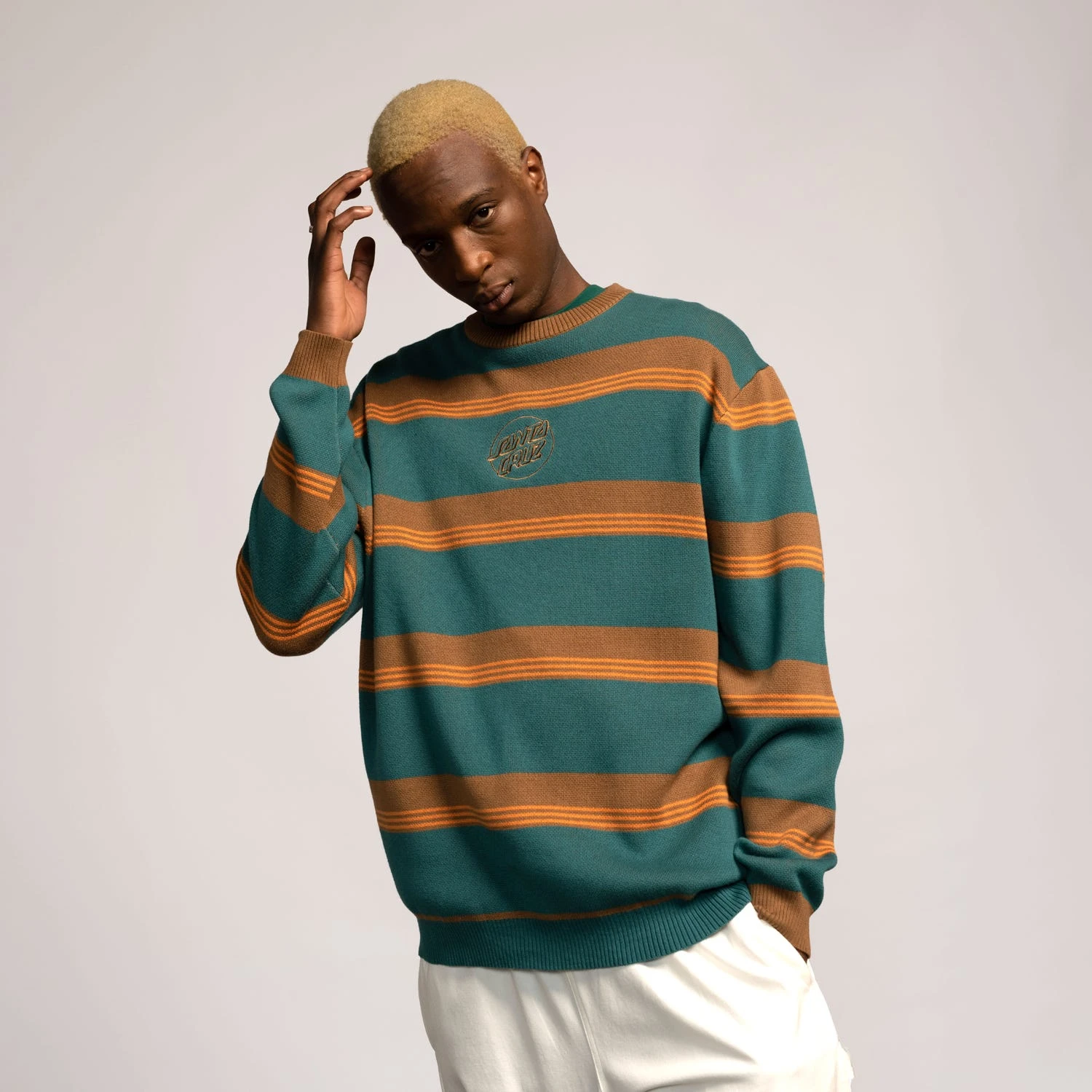 100% cotton knitted crew, regular fit, with engineered stripe, chest embroidery and hem woven label