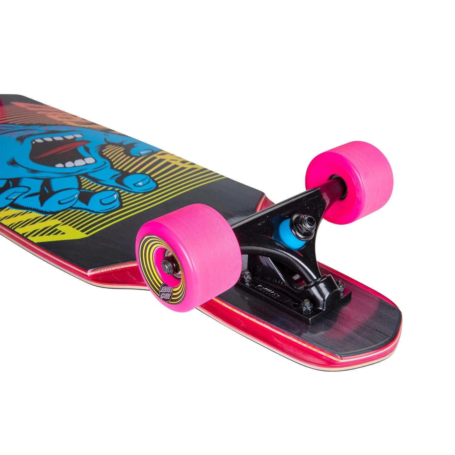 Santa Cruz Skateboards Split Hand Dropdown Longboard Cruzer with updated, modern medium sized drop down shape with routed wheel wells, new 160mm Bullet reverse kingpin downhill trucks and 66mm Santa Cruz branded Slime Balls wheels.
