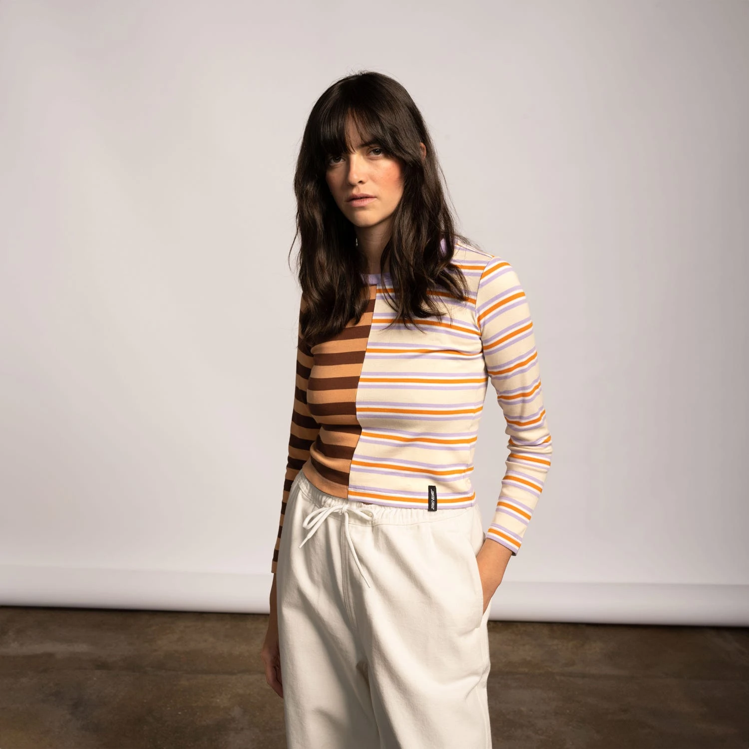 70% cotton, 30% polyester, 210gsm rib jersey, cropped fit, long sleeve t-shirt with engineered stripe and hem woven label
