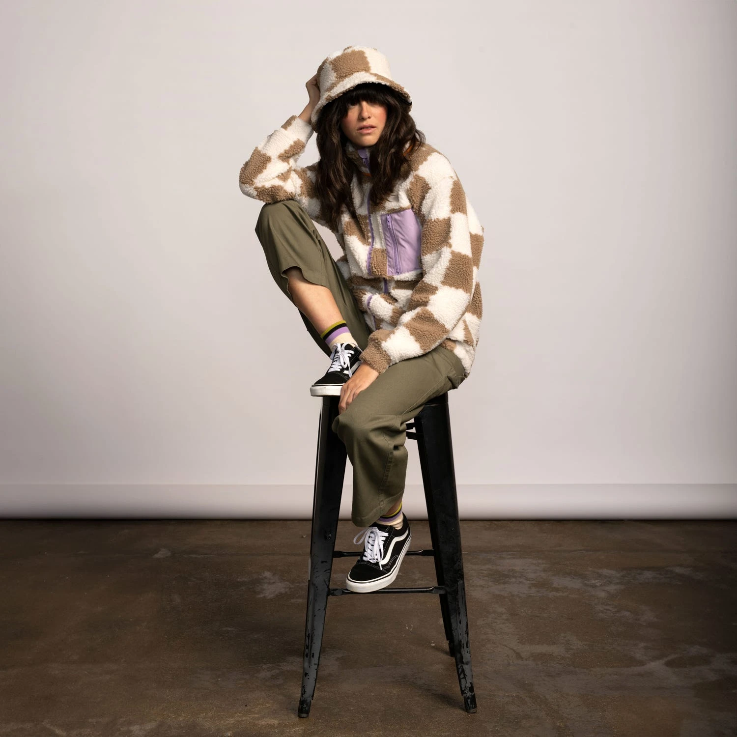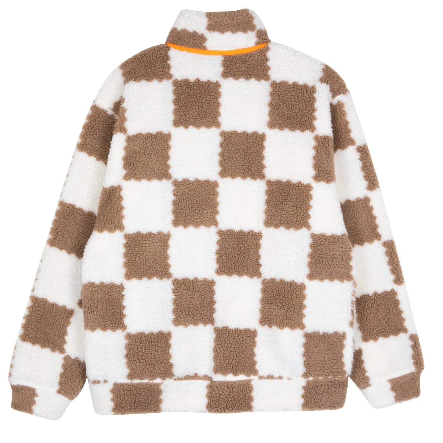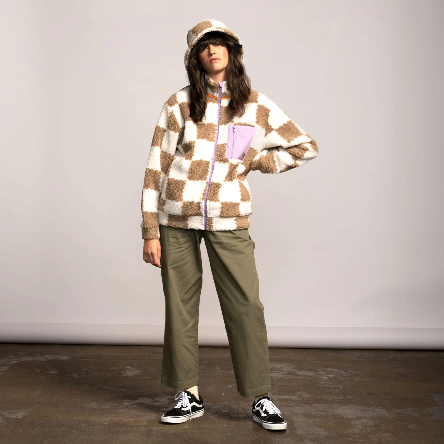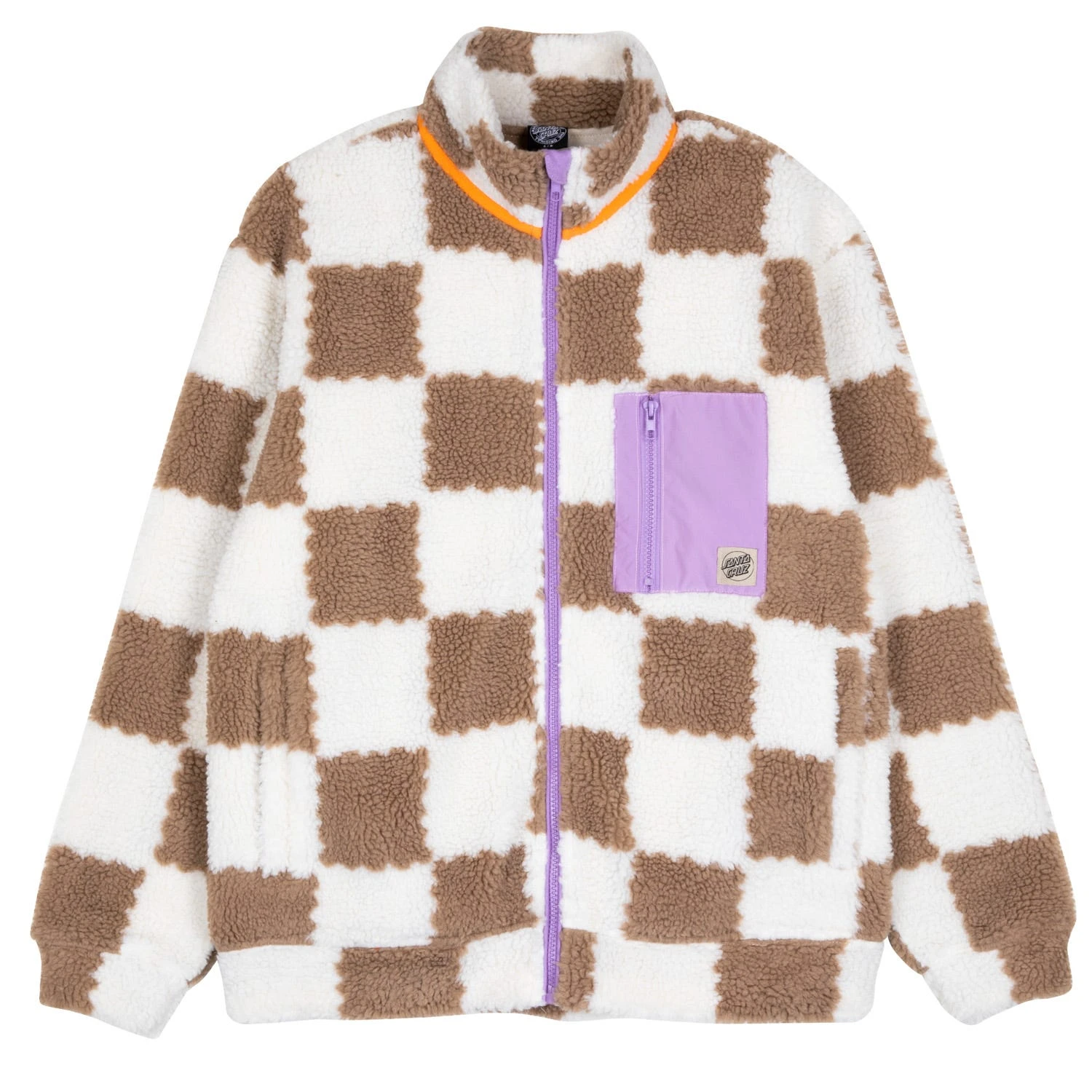 100% polyester, sherpa fleece, zip jacket with contrast zip and neck binding, all over pattern and left chest pocket with woven label