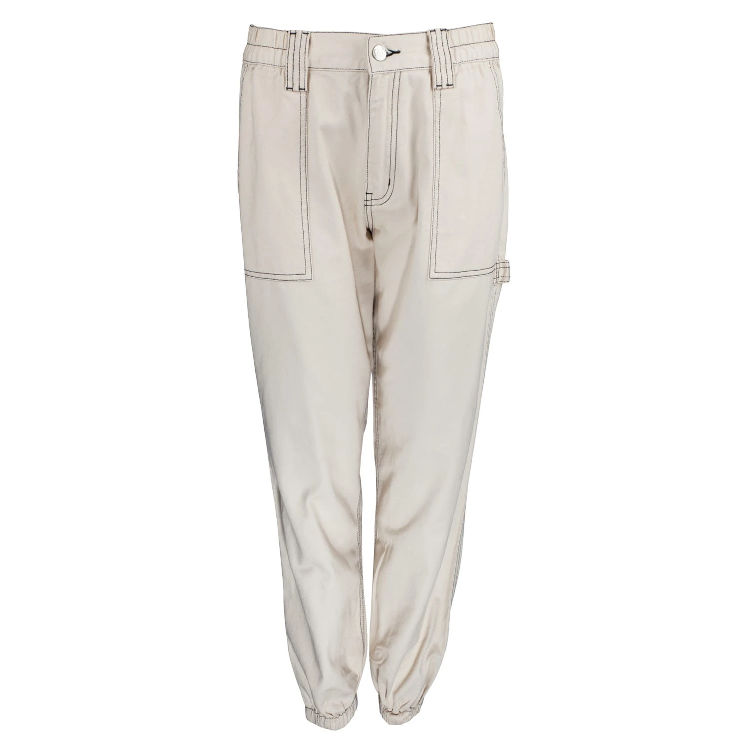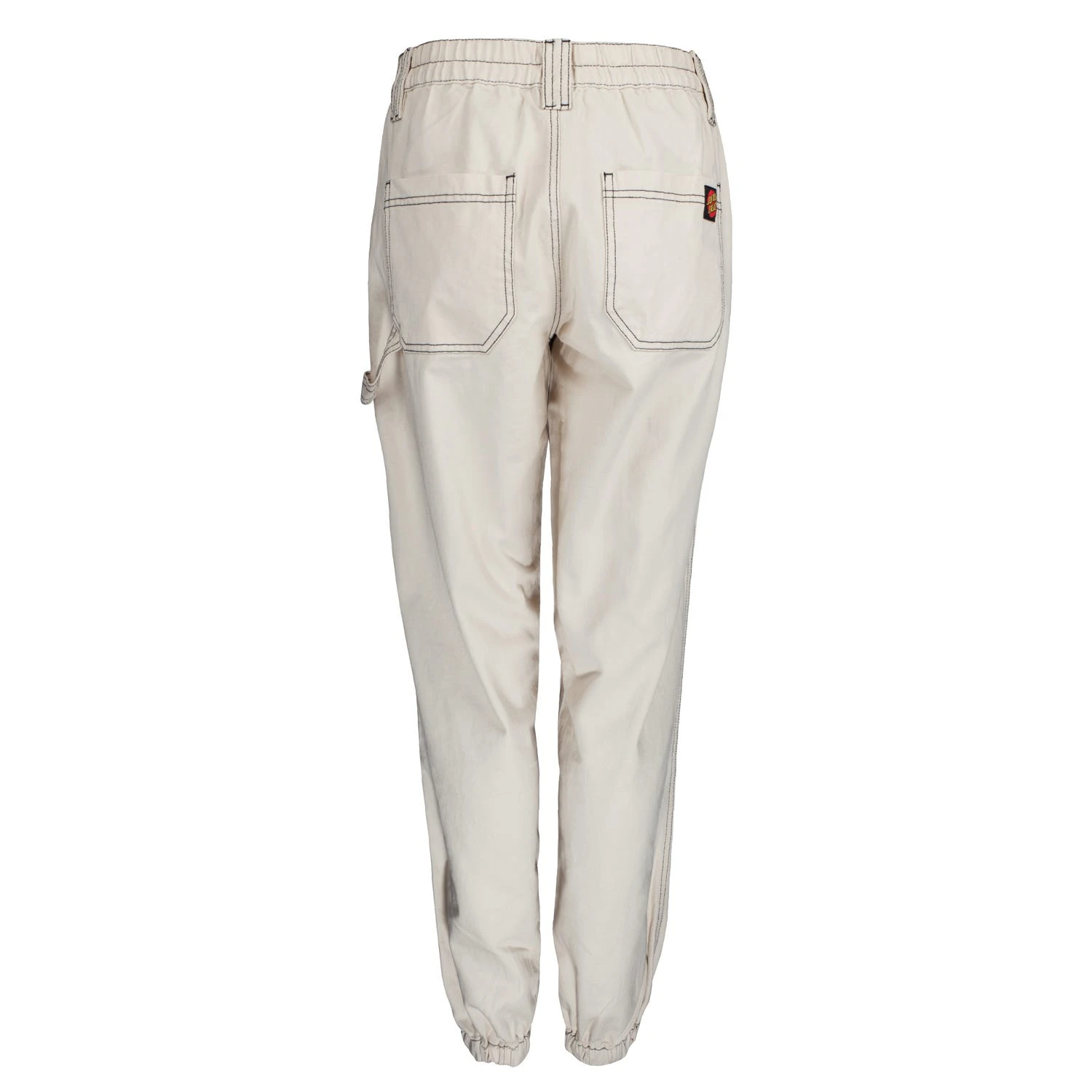 100% cotton twill, regular fit, trouser with front patch pockets, elasticated waist and hems, carpenter strap, rear pockets and back woven label branding