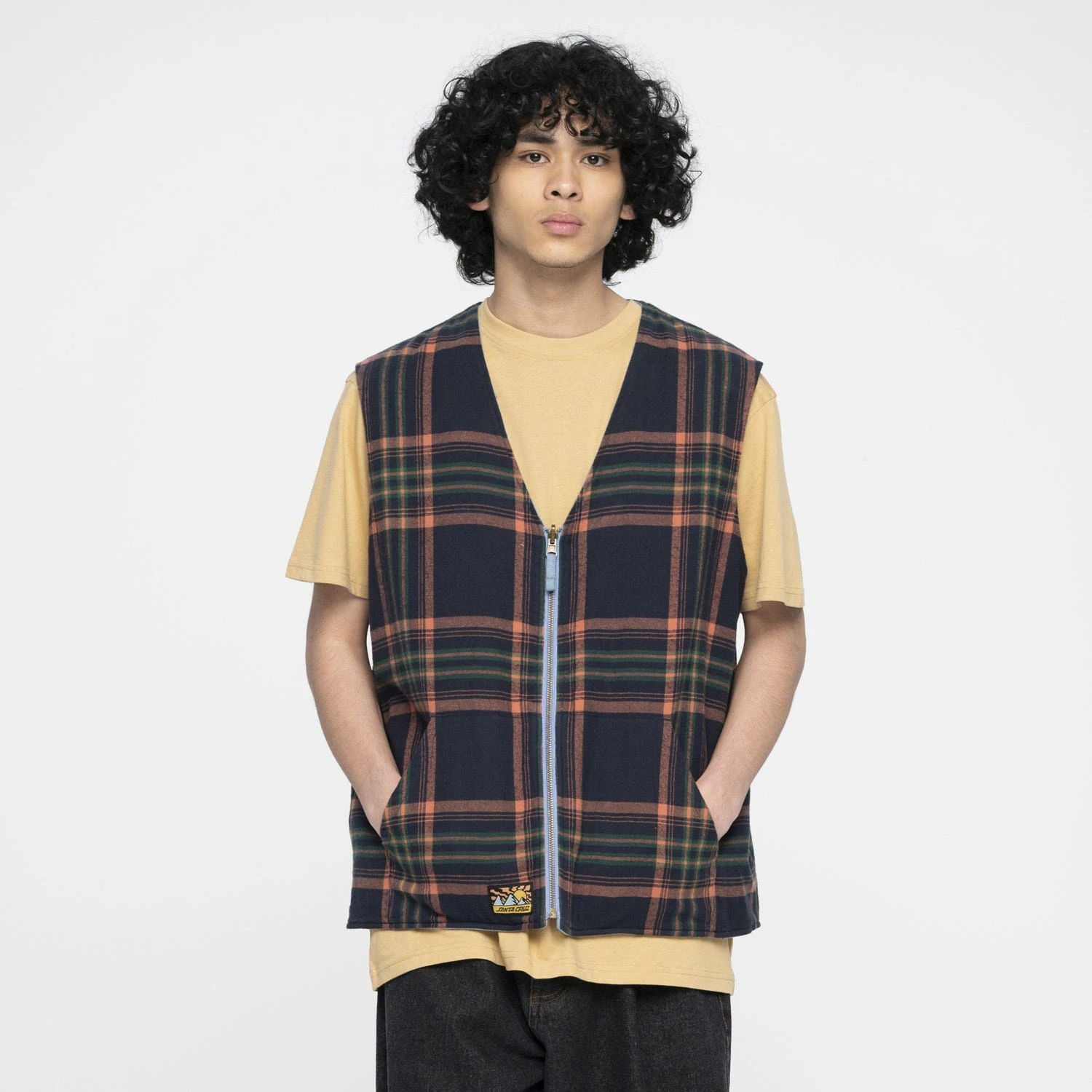100% cotton brushed flannel / 100% cotton light weight denim, regular fit, reversible zip vest, flannel side with front pouch pocket and pocket woven label and denim side with two front welt pockets and chest embroidery